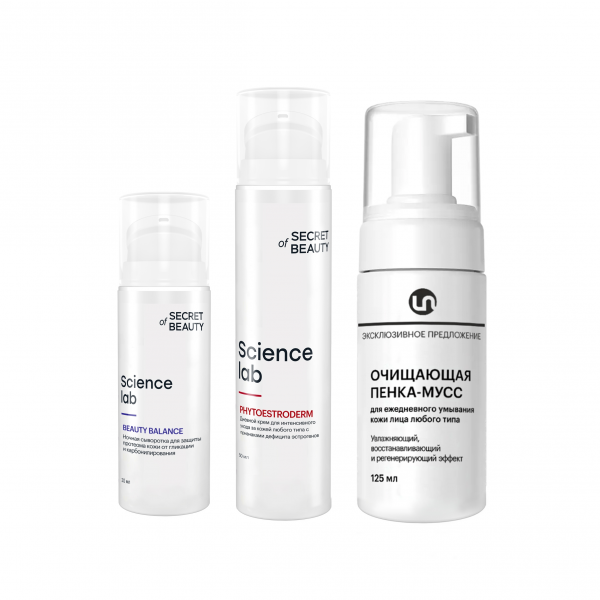 борьбы с дефицитом эстрогенов, гликацией и карбонилированием - ночная сыворотка "БЬЮТИ БАЛАНС" и дневной крем "ФИТОЭСТРОДЕРМ" , которые вошли в состав набора. Кроме того программа дополнена Очищающей пенкой-муссом на основе натурального ПАВ, пенку вы получаете в ПОДАРОК.